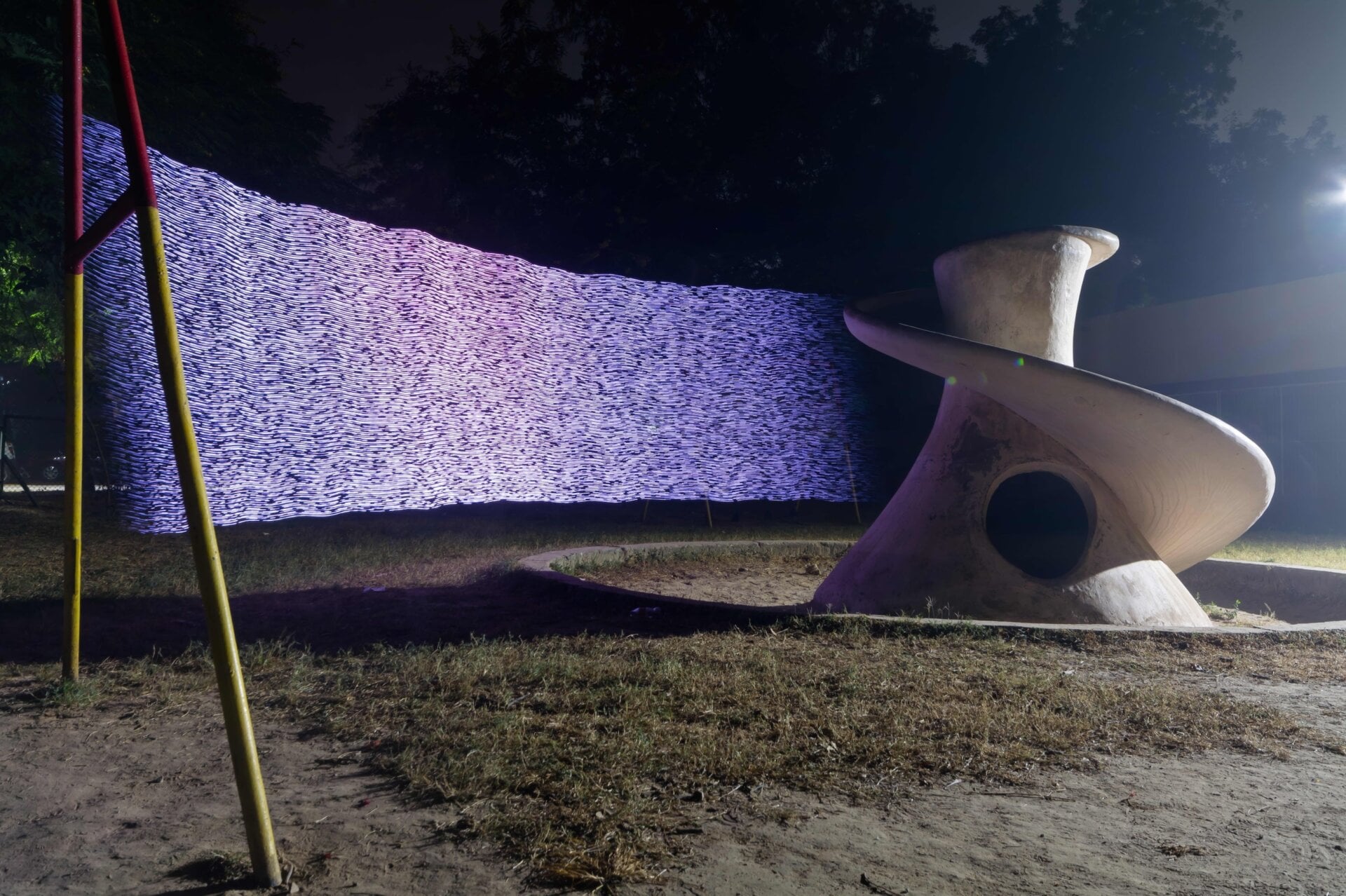 Peut-être que les plus obsédantes de la série étaient les deux peintures lumineuses réalisées dans des terrains de jeux indiens. Les terrains de jeux se trouvaient à Palampur et à Delhi, À 300 miles (500 kilomètres) les uns des autres. Le terrain de jeu de Delhi contenait environ 12,5 fois la quantité de particules dans l’air que le site de Palampur.